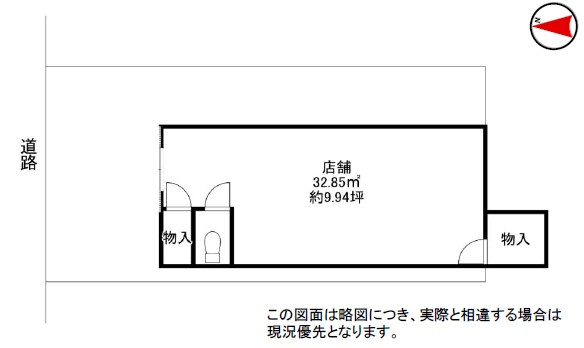 【備 考】 @建物間口:約3.8m、奥行:約8m。 A水道代月額2,750円(税込)。業種により水道料の変更あり。 B保証人2名要、保証会社加入要(別途保証料要)、火災保険加入要(その都度金額は要確認)。 C窓ガラスへの広告類掲示一切不可。 |